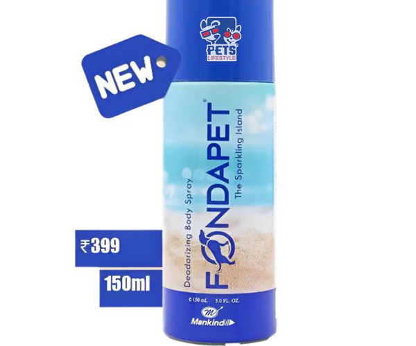 FONDAPET The Sparkling Island Deodorizing Body Spray (150 ml): A pet-friendly aromatic body mist crafted to neutralize unpleasant odors and refresh your companion’s coat between baths. Featuring an alcohol-based formula with Cyclopentasiloxane for fast-drying, this spray ensures long-lasting tropical freshness. Safe for dogs, cats, puppies, and kittens, it’s a gentle, no-rinse solution to maintain clean-smelling fur.